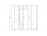 Шкаф разделен на две зоны для хранения. Слева располагаются четыре полки для хранения белья. Справа размещена металлическая штанга для хранения верхней одежды. Над штангой расположена полка. Центральная створка без ручки, открывается после открытия основной правой створки. В самом центре шкафа под створкой с зеркалом имеются два выдвижных ящика на шариковых направляющих глубиной 400 мм. Высота боковины ящика 138 мм. Максимально допустимая равномерно распределенная нагрузка на ящики до 8 кг.