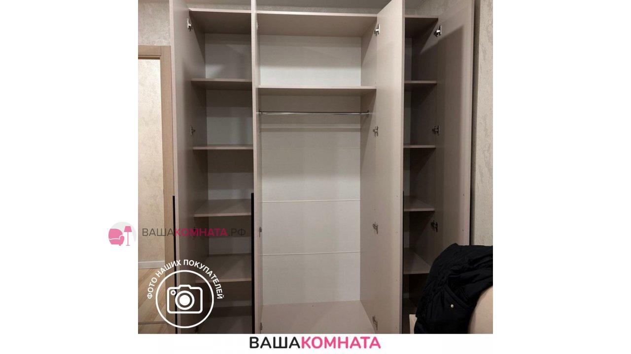 За двумя центральными дверьми находится широкая штанга для вешалок-плечиков с верхней одеждой, деловыми костюмами, красивыми платьями и другой одеждой. Полки, скрытые за боковыми дверьми, пригодятся для сложенной одежды, постельного и нижнего белья, разнообразных аксессуаров и коробок с обувью.